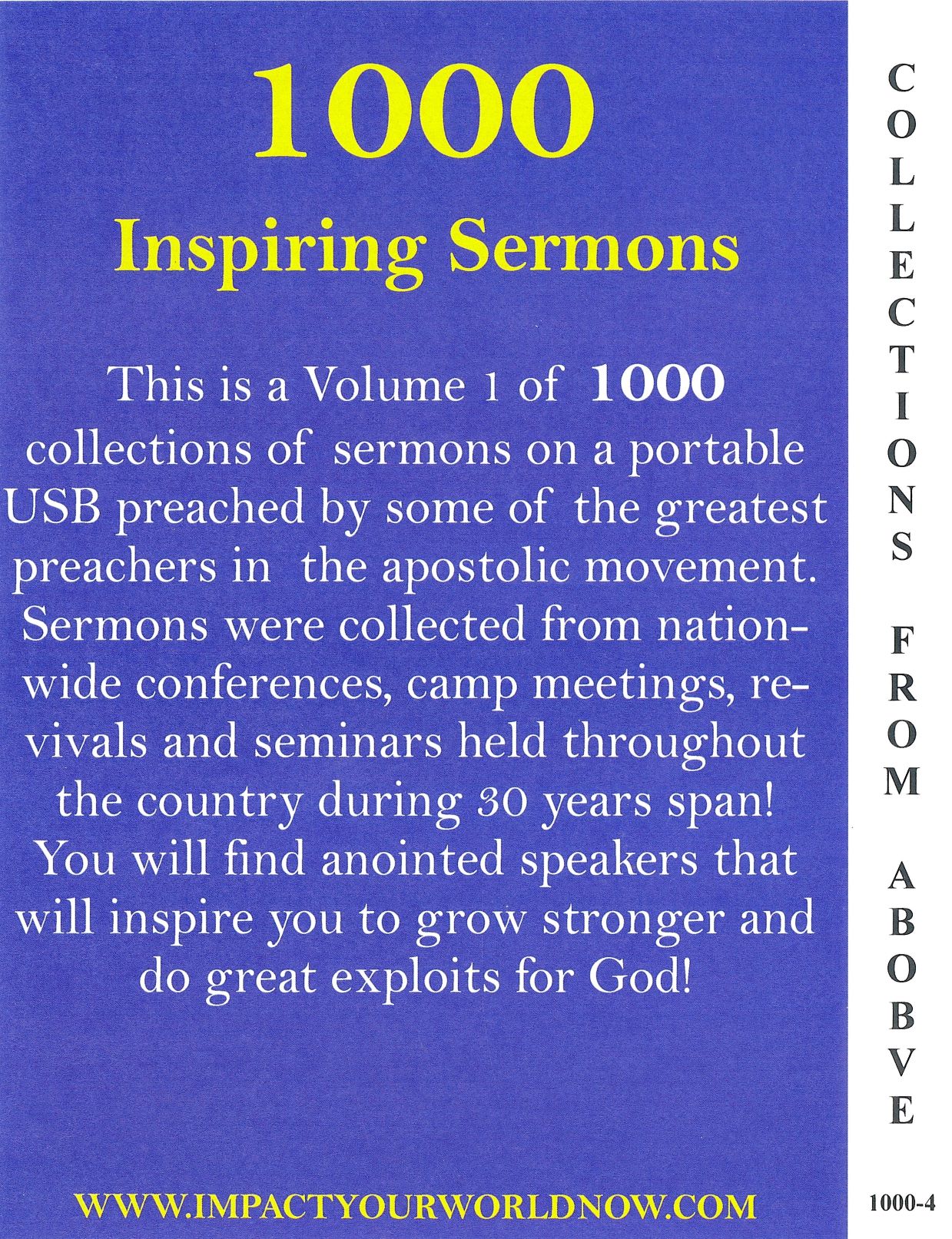 1000 Sermons preached by some of the most renown preachers in Pentecost Spanning 30 years. Sermons were recorded in camp meetings, revivals, conferences and seminars throughout the United States.