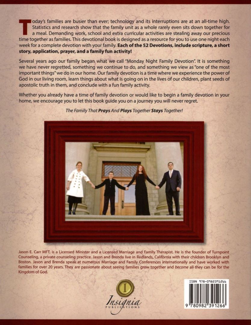 Statistics and research show that the family unit as a whole rarely even sits down together for a meal. Demanding work, school and extra curricular activities are stealing away our precious time together as families. This devotional book is designed as a resource for you to use one night each week for a complete devotion with your family. Each of the 52 Devotions, include scripture, a short story, application, prayer, and a family fun activity!