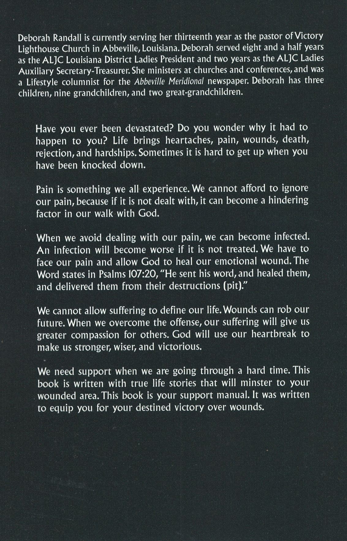Pain is something we all experience. We cannot allow suffering to define our life. We need support when we are going through a hard time. This book is written with true-life stories that will minister to your wounded area. It was written to equip you for your destined victory over wounds.