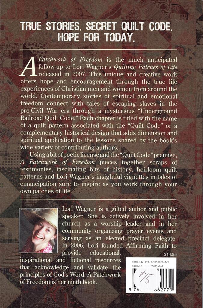 Using a bit of poetic license and the "Quilt Code” premise, A Patchwork of Freedom pieces together scraps of testimonies, fascinating bits of history, heirloom quilt patterns and Lori Wagner’s insightful vignettes in tales of emancipation sure to inspire as you work through your own patches of life.