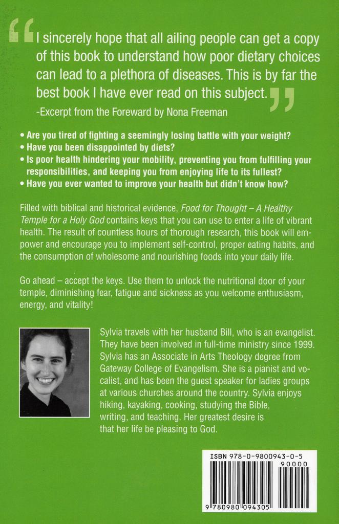 Filled with biblical and historical evidence, Food for Thought - A Healthy Temple for a Holy God contains keys that you can use to enter a life of vibrant health. The result of countless hours of thorough research, this book will empower and encourage you to implement self-control, proper eating habits and the consumption of wholesome and nourishing foods into your daily life.