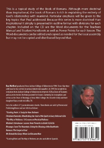 This is a topical study of the Book of Romans. Although more doctrinal than inspirational, the book of Romans is rich in explaining the entirety of God’s relationship with mankind. Particular emphasis will be given to the key topics that Paul addressed. Because this series is more doctrinal than inspirational it simply is presented in outline format with divisions for each chapter. Included on the CD are the Word documents for the Teachers Manual and Student Handbook as well as PowerPoints for each lesson. The Word documents can be edited and copied as needed for the local assembly but may not be copied and distributed beyond that.