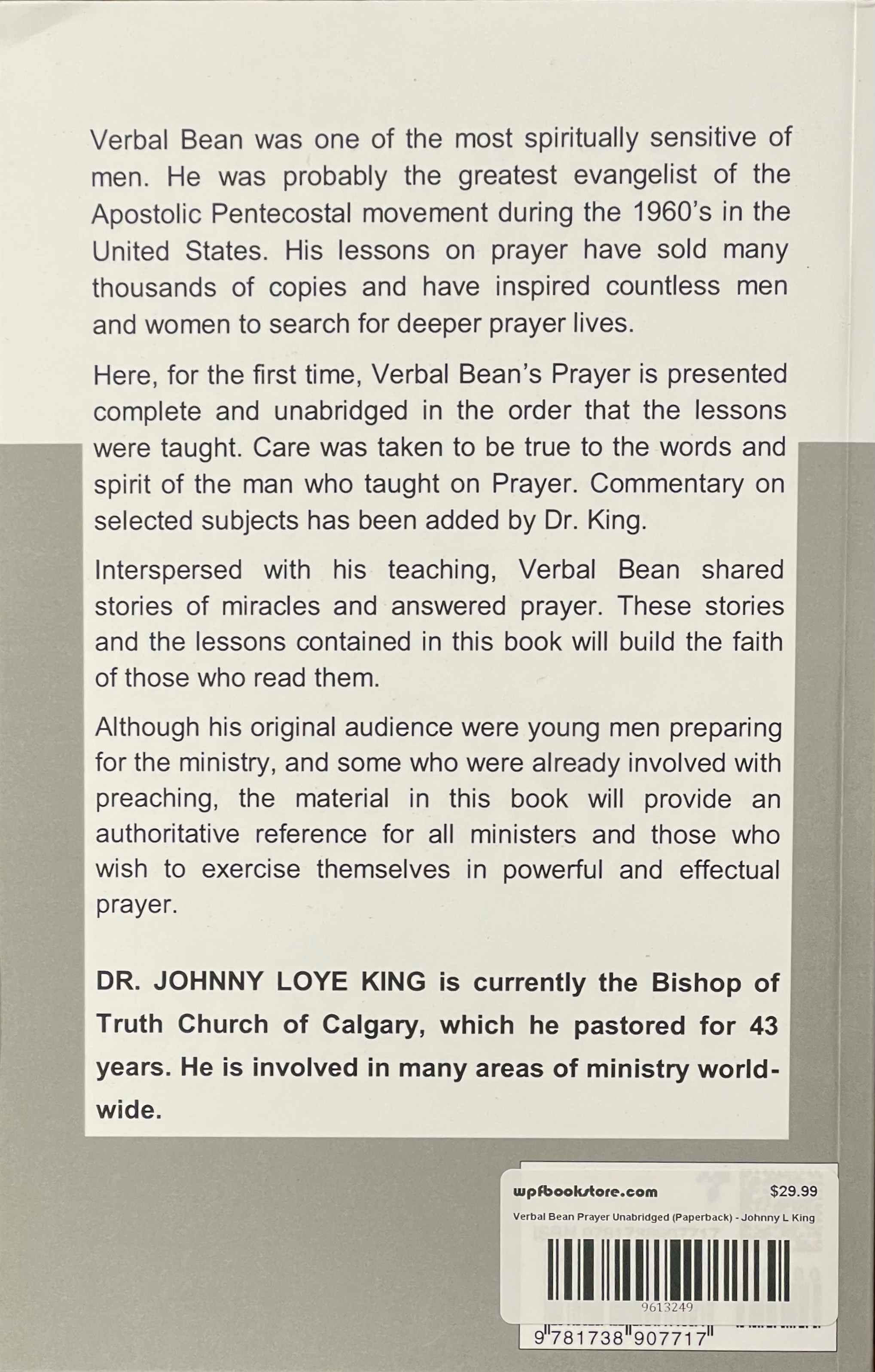 Here, for the first time, Verbal Bean's Prayer is presented complete and unabridged in the order that the lessons were taught. Care was taken to be true to the words and spirit of the man who taught on Prayer. Commentary on selected subjects has been added by Dr. King.